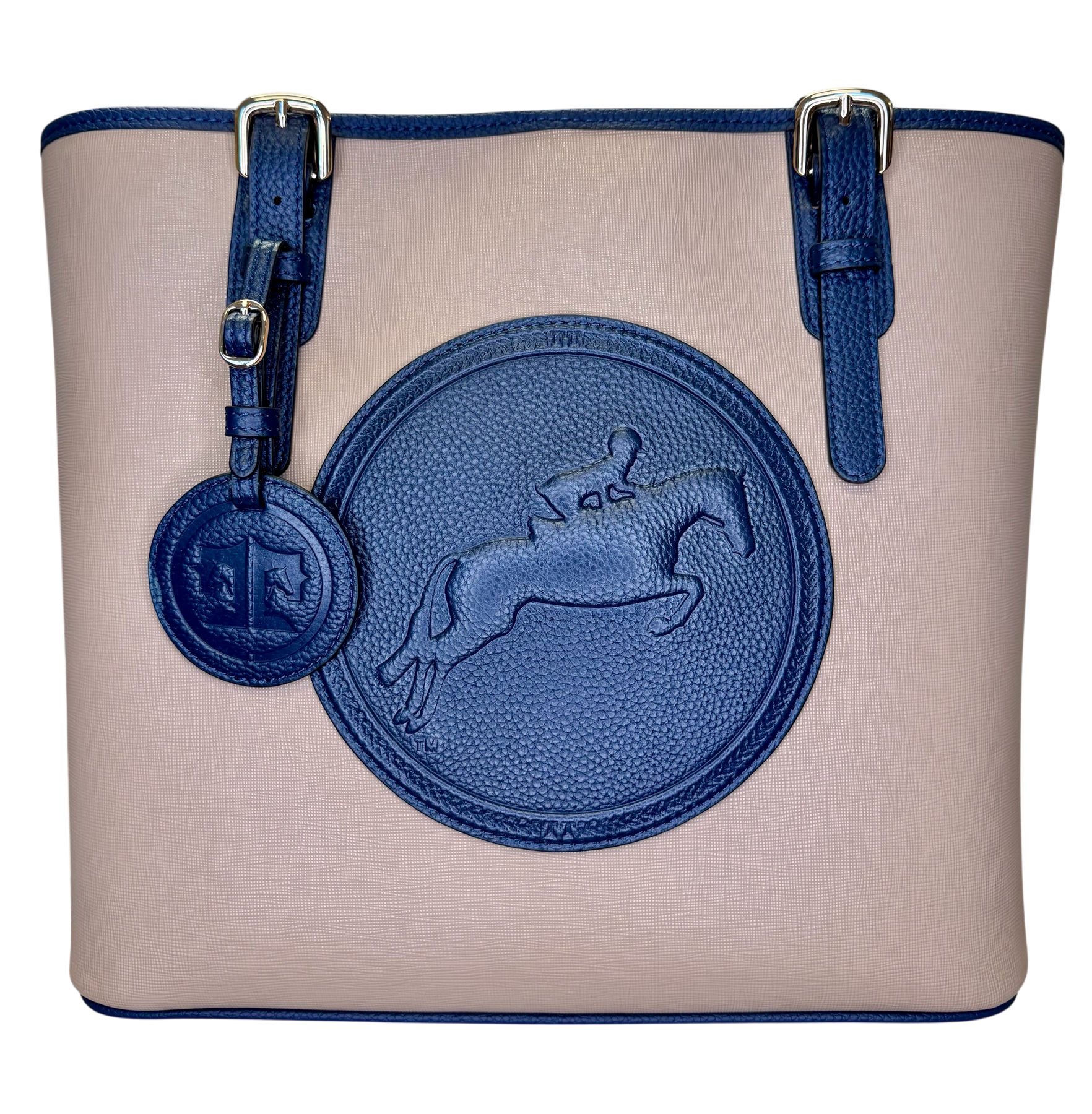 The James River Carry All ~ our most versatile and durable creation yet. This generous tote that does “carry all” is named in tribute to Jill’s father, who attended every show and the start of every hunt. Featuring scratch-resistant saffiano leather exterior, this handbag stands firm on carrying daily essentials for busy barn days, travel, or the mobile office. The roomy scarlet interior contains pockets for smart phone, key fob, large zip pocket and tablet compartment with embossed leather logo. Completed with silver hardware and feet, embossed with the discipline of your choice in pebble-grain leather in contrasting color.