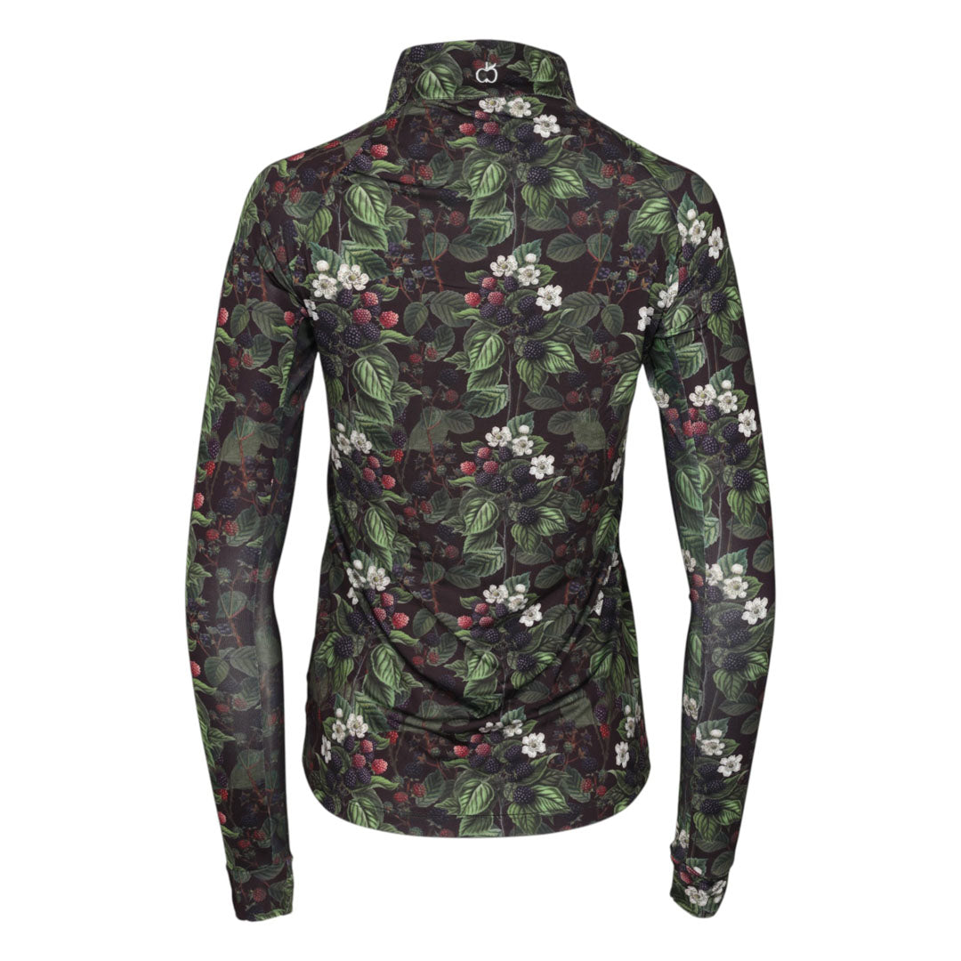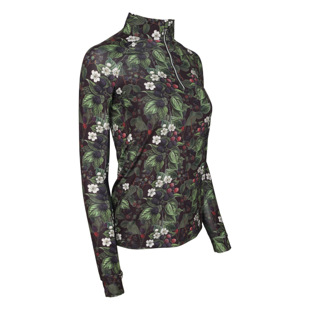 The elegant Blackberry Daze Riding Shirt is a premium 1/4 Zip top featuring a moody and captivating design that's a perfect nod to summer’s last lazy days. This rich pattern showcases vintage blackberry vines weaving to create a unique and sophisticated look, making it a standout piece for any equestrian. Crafted from a perfectly light, feather-weight fabric with an incredible 'ice feel', this equestrian sun shirt offers superior protection in warm temperatures or serves as a comfortable layering piece when the weather cools. Designed true to size and elegantly fitted, its longer length ensures it stays neatly tucked into your breeches for a polished look in the saddle and beyond.