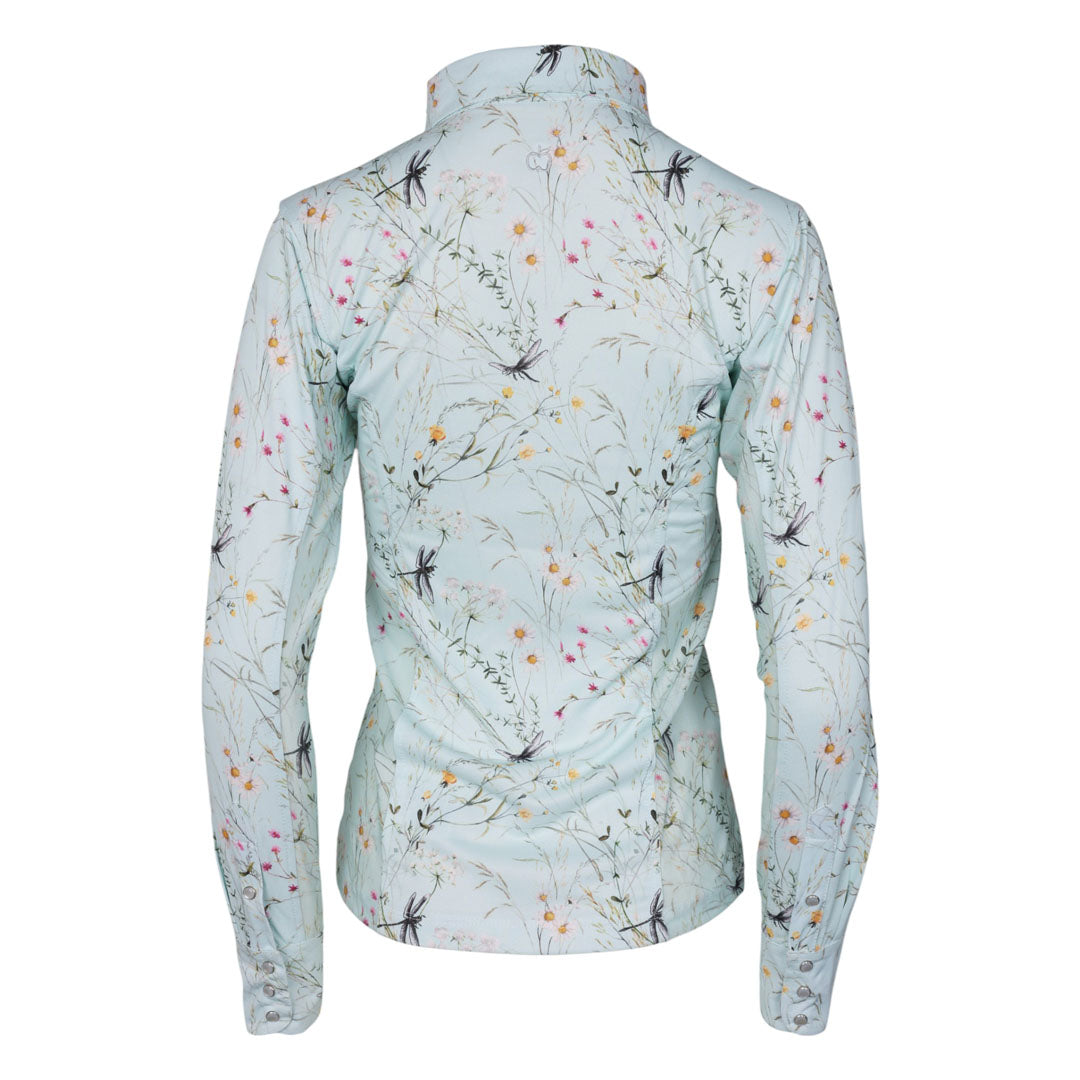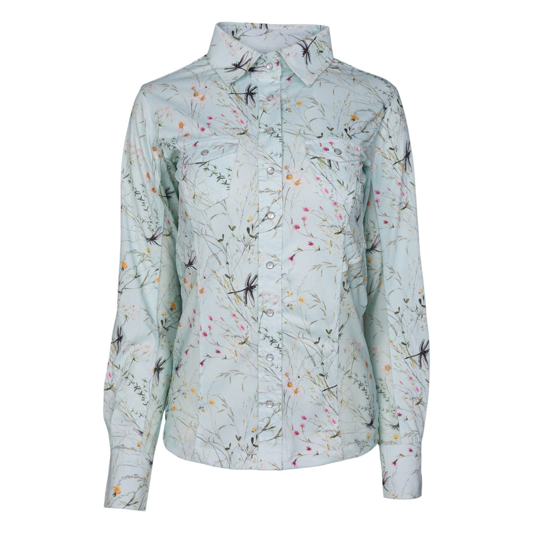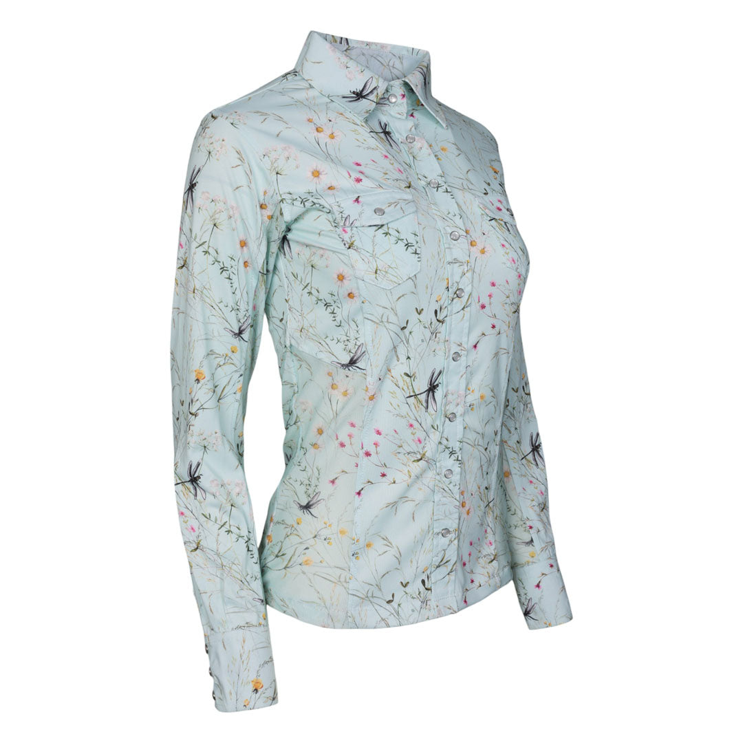 Introducing Dapplebay's new Western Riding Shirt – a technical western top that perfectly blends classic style with modern performance! Featuring our magical Dragonfly Meadow design in soft green with delicate dragonfly and floral details, this exceptional Western Shirt offers unmatched comfort. It's crafted from a lightweight, breathable, and stretchy fabric, ensuring ease in the show pen or on the trail. Seamlessly integrated mesh side panels and underarms provide superior airflow, keeping you cool. Complete with classic pearl snap buttons (top four usable, rest fixed for easy wear) and a flattering fitted shape, it's designed for Western Dressage, all Western disciplines, or simply stylish casual wear. Complete your Dapplebay western look with this essential new top!
